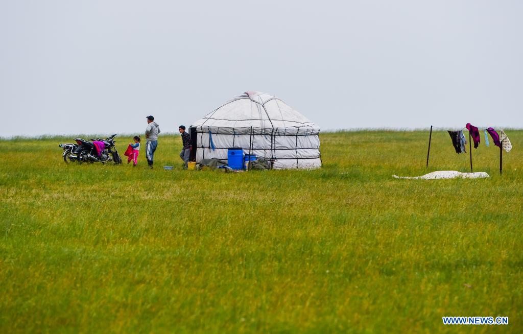 Herdsmen walk out of a mongolian tent on the Xilingol Grassland in North China's Inner Mongolia autonomous region, July 12, 2021. [Photo/Xinhua]