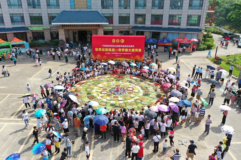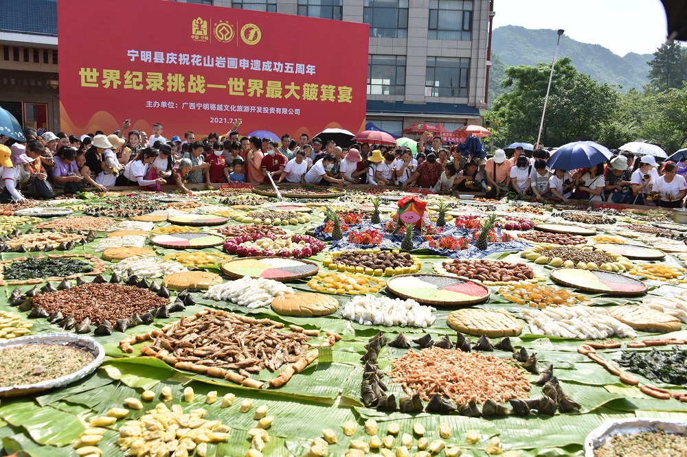 On July 15, to celebrate the 5th anniversary of the inscription of the local Zuojiang Huashan Rock Art,which announced its World Heritage, Ningming county, in Guangxi Zhuang autonomous region, held a grand "dustpan feast" with the ethnic Zhuang delicacy.