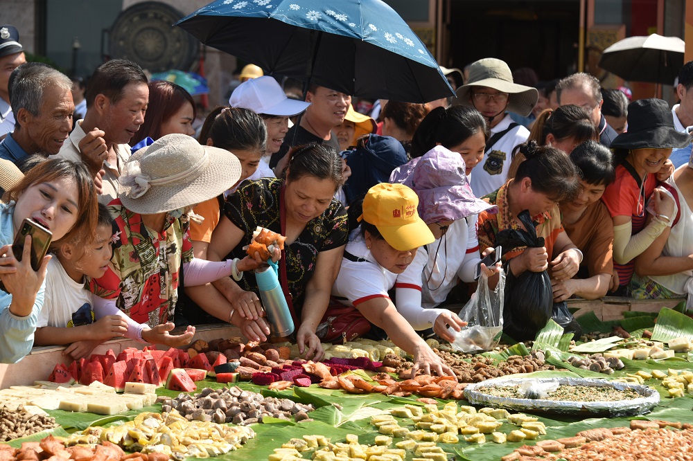The bamboo "dustpan" is 10 meters in diameter, upon which fresh banana leaves are laid and a variety of local dishes are served. Locals and tourists alike were invited to enjoy this grand feast in the parking lot of a hotel.