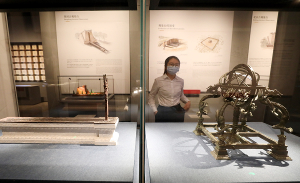 A woman looks at an ancient astronomical observing equipment at the Shanghai Astronomy Museum in East China's Shanghai, July 17, 2021. [Photo/Xinhua]