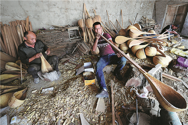 Villagers make musical instruments by hand in Jiayi village in Aksu prefecture in the Xinjiang Uygur autonomous region this month. About 120 people from the village make 20,000 traditional musical instruments annually. [Photo by Wei Xiaohao/China Daily]