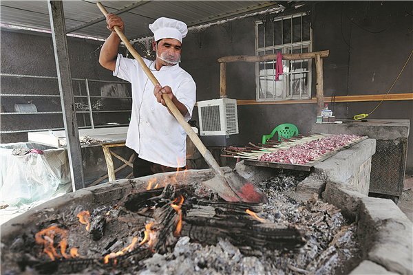 A chef makes barbecue in Shaya county, Xinjiang, this month. [Photo by Wei Xiaohao/China Daily]