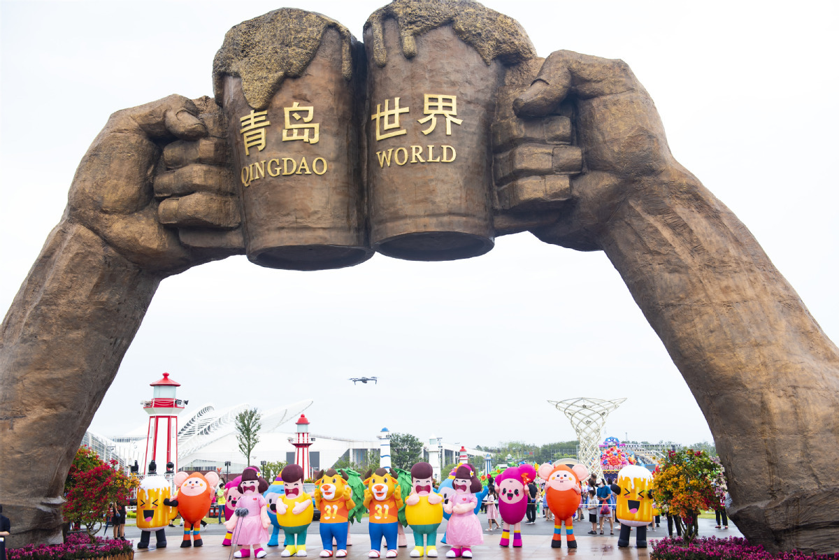 Mascot performers act under the giant sculpture "Qingdao toasts the world" at the Golden Beach Beer City in the Qingdao West Coast New Area. [Photo provided to chinadaily.com.cn]