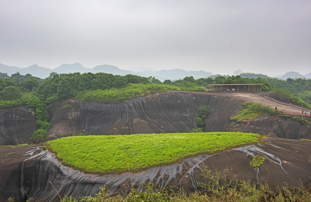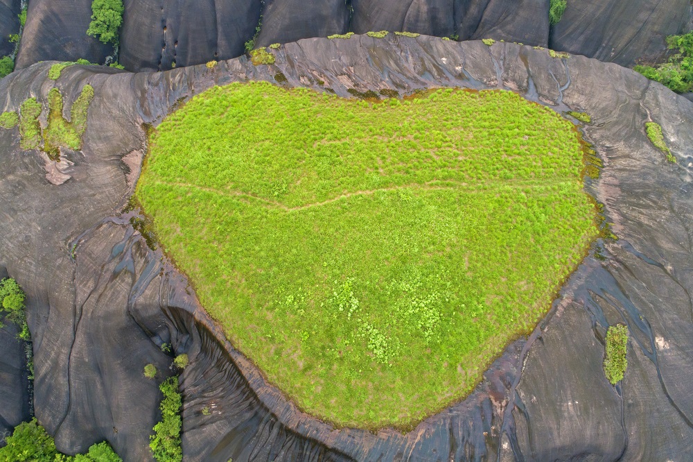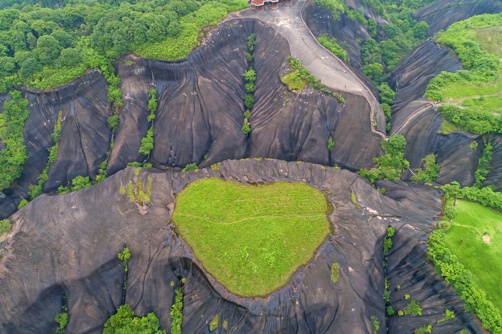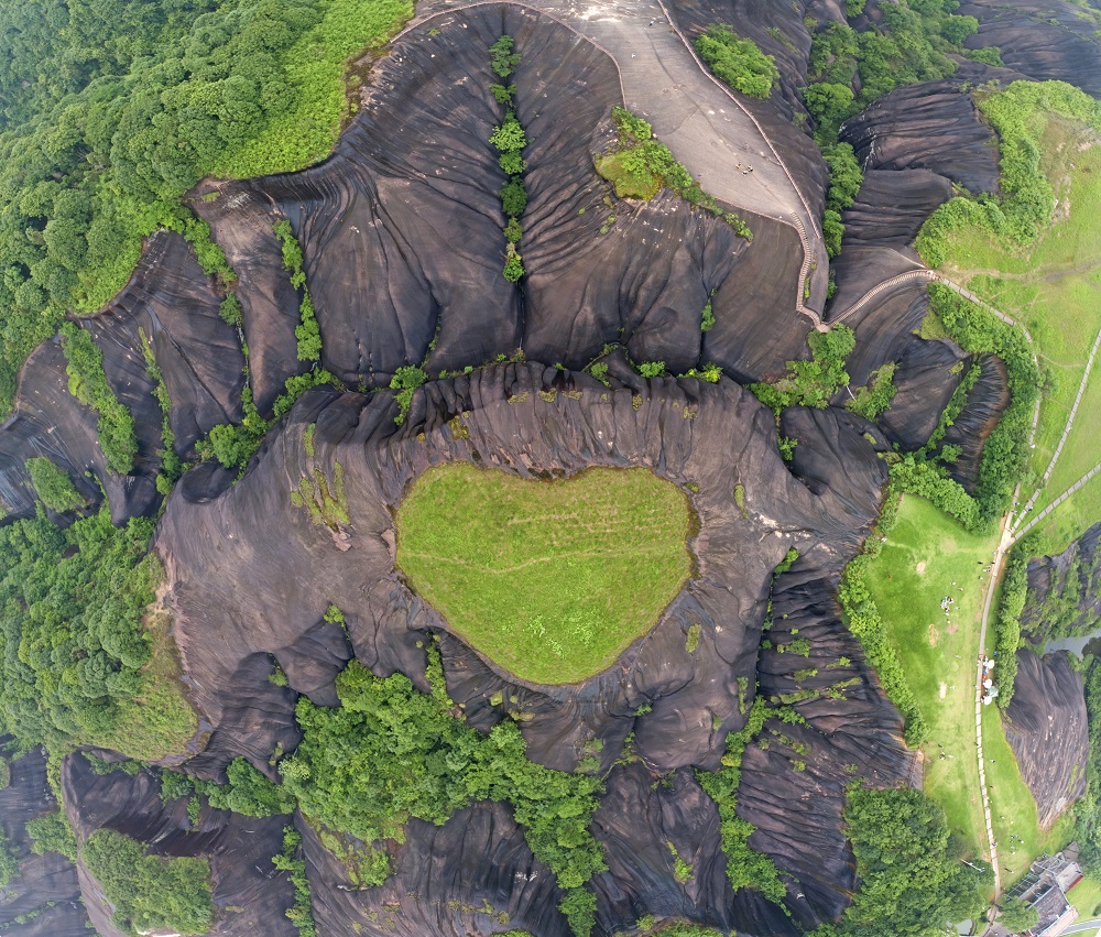 You might take it as a heart-shaped matcha cake and chocolate at first sight, but it is actually a natural wonder at the Feitianshan National Geo-Park in Chenzhou, Hunan province! With a splash of green, it adds vitality to the marvelous Danxia landscape.