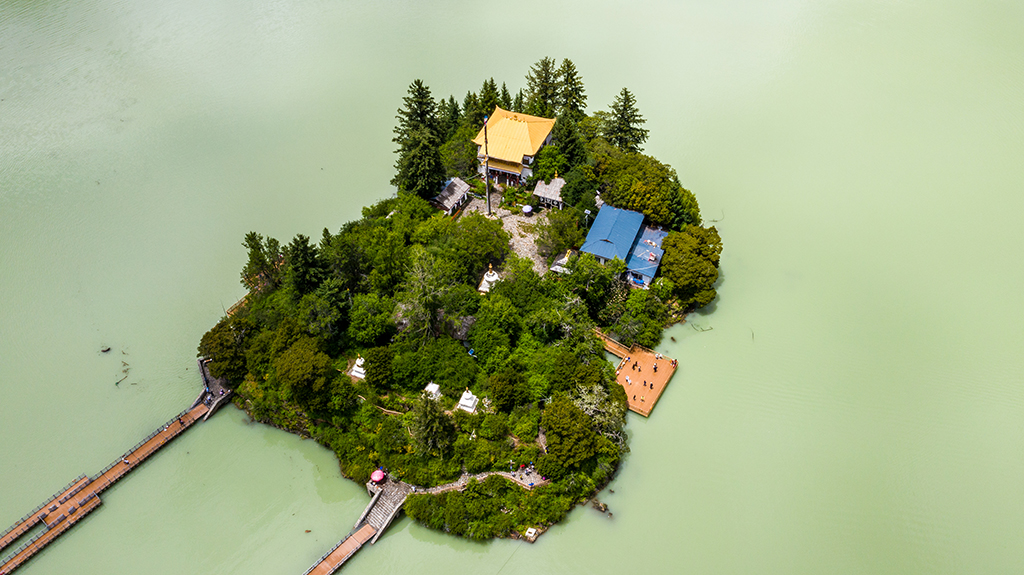 About 100 meters from the banks of Basom Tso Lake, there’s the small island of Zhaxi. Legend has it that it’s a “hollow island” because it floats on the water. Built in the late Tang Dynasty (618-907), Cuozong Gongba Temple on Zhaxi Island is a famous temple of the Nyingma-Red Sect, a place for worship for Padmasambhava, the Thousand-armed Avalokitesvara (guanyin), the Golden Boy and the Jade Maiden.