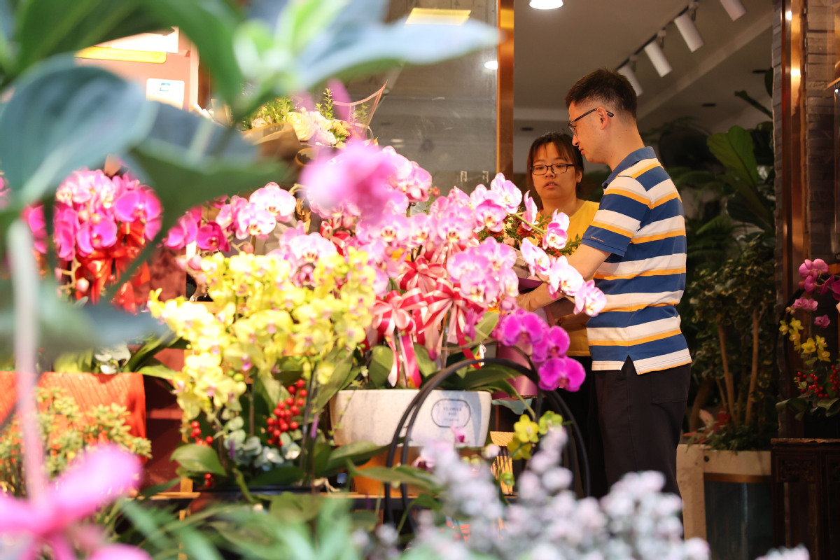 Consumers select flowers at a flower shop in Xiamen, Fujian province, on May 7, 2021. [Photo/IC]
