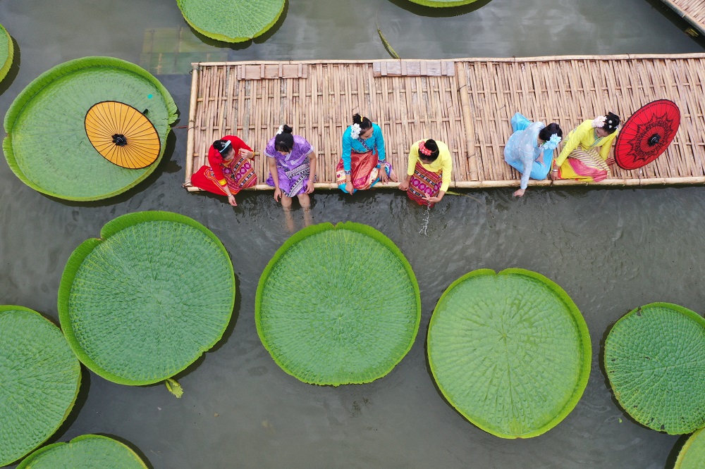 Women in beautiful ethnic costumes admire the beauty of the Victoria lilies.