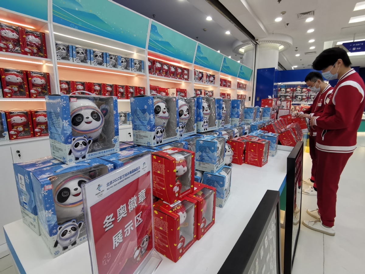 Souvenirs are displayed at a flagship store for 2022 Winter Olympics in Beijing, on Feb 16, 2021. [Photo/IC]