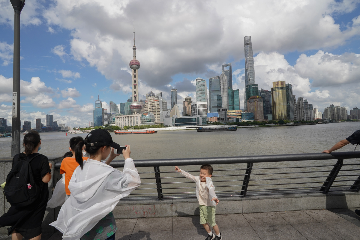 Visitors take pictures at the bund in Shanghai, on July 19, 2021. [Photo/IC]