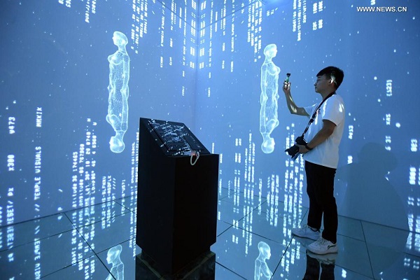 A visitor is seen at the 2021 Asia Digital Art Exhibition at the Times Art Museum in Beijing, capital of China, July 23, 2021. The exhibition, which opened on Friday and will last till Aug 31, showcases more than 50 digital artworks created by over 60 artists and groups from seven countries and regions. [Xinhua/Ren Chao]
