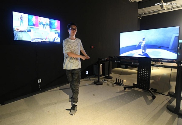 A staff member shows a digital art installation during the 2021 Asia Digital Art Exhibition at the Times Art Museum in Beijing, capital of China, July 23, 2021. The exhibition, which opened on Friday and will last till Aug 31, showcases more than 50 digital artworks created by over 60 artists and groups from seven countries and regions. [Xinhua/Ren Chao]