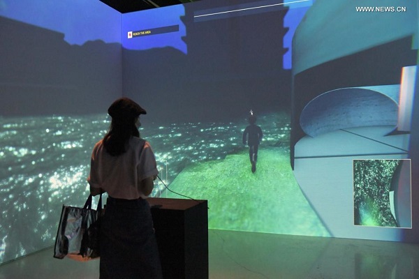 A visitor interacts with a digital art installation during the 2021 Asia Digital Art Exhibition at the Times Art Museum in Beijing, capital of China, July 23, 2021. The exhibition, which opened on Friday and will last till Aug 31, showcases more than 50 digital artworks created by over 60 artists and groups from seven countries and regions. [Xinhua/Cao Mengyao]