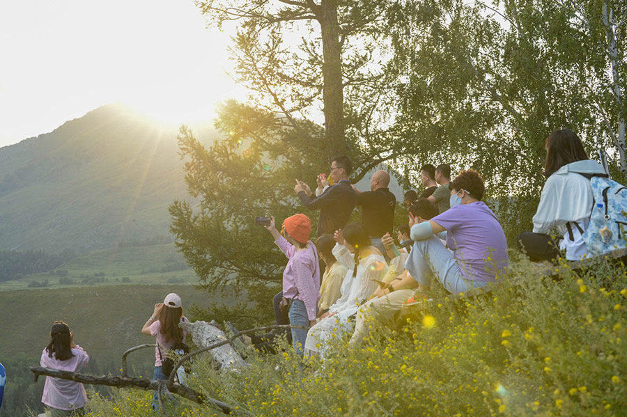 Tourists visit Hemu village at Kanas Nature Reserve, Altay prefecture, Xinjiang Uygur autonomous region on July 24. [Photo/Xinhua]