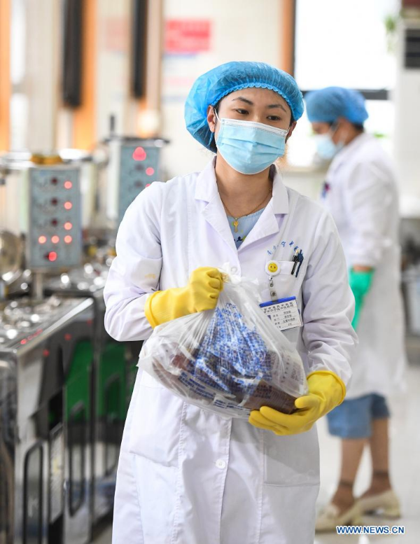 A pharmacist of Jiangning Chinese medical hospital transfers doses of traditional Chinese medicine (TCM) decoctions in Nanjing, capital of east China's Jiangsu Province, July 27, 2021. So far, the hospital has distributed over 15,000 doses of TCM decoctions to help control the recent spike in COVID-19 infections in Nanjing. (Xinhua/Ji Chunpeng)