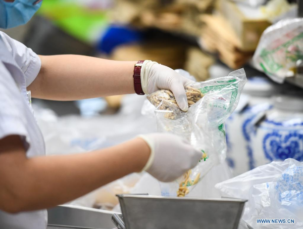 A pharmacist of Jiangning Chinese medical hospital prepares ingredients to produce traditional Chinese medicine (TCM) decoctions in Nanjing, capital of east China's Jiangsu Province, July 27, 2021. So far, the hospital has distributed over 15,000 doses of TCM decoctions to help control the recent spike in COVID-19 infections in Nanjing. (Xinhua/Ji Chunpeng)
