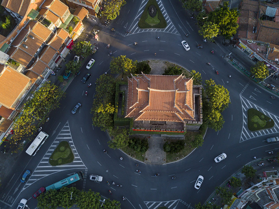 An aerial photo shows Chaotianmen gate, one of the seven ancient city gates in Quanzhou. [Photo/Xinhua]