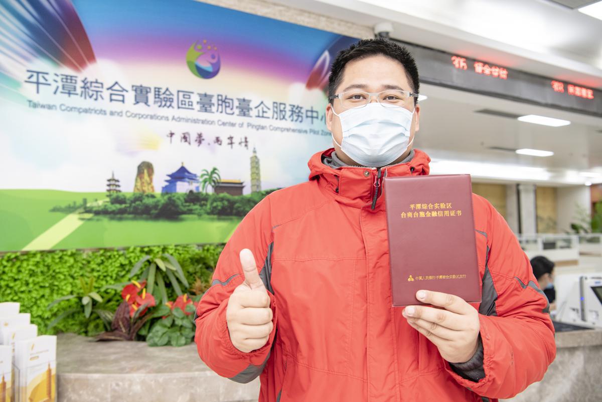 A man shows his new financial credit certificate for Taiwan compatriots. It allows them to get the same financial services as local residents. [Photo provided to chinadaily.com.cn]