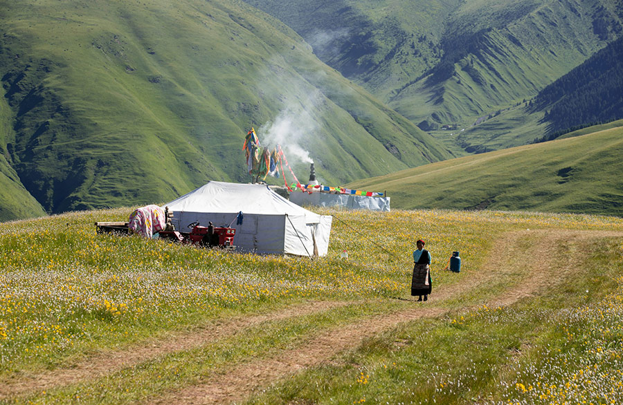 A Tibetan man walks on the grassland on July 22 at Bairi Mountain in Dawu county. [Photo/Xinhua]