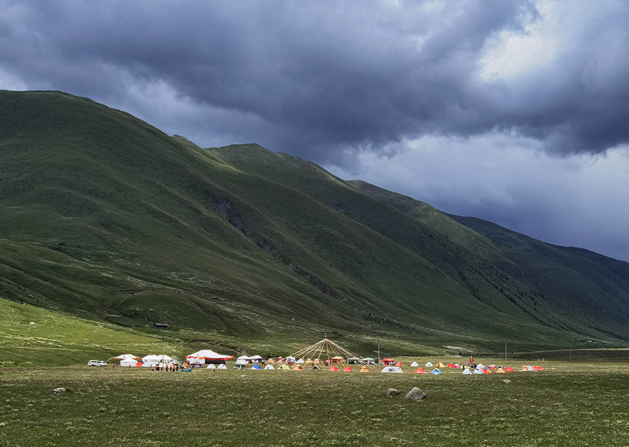 Tibetan people set up tents for leisure on July 25 in the Longdeng grassland of Dawu county. [Photo/Xinhua]