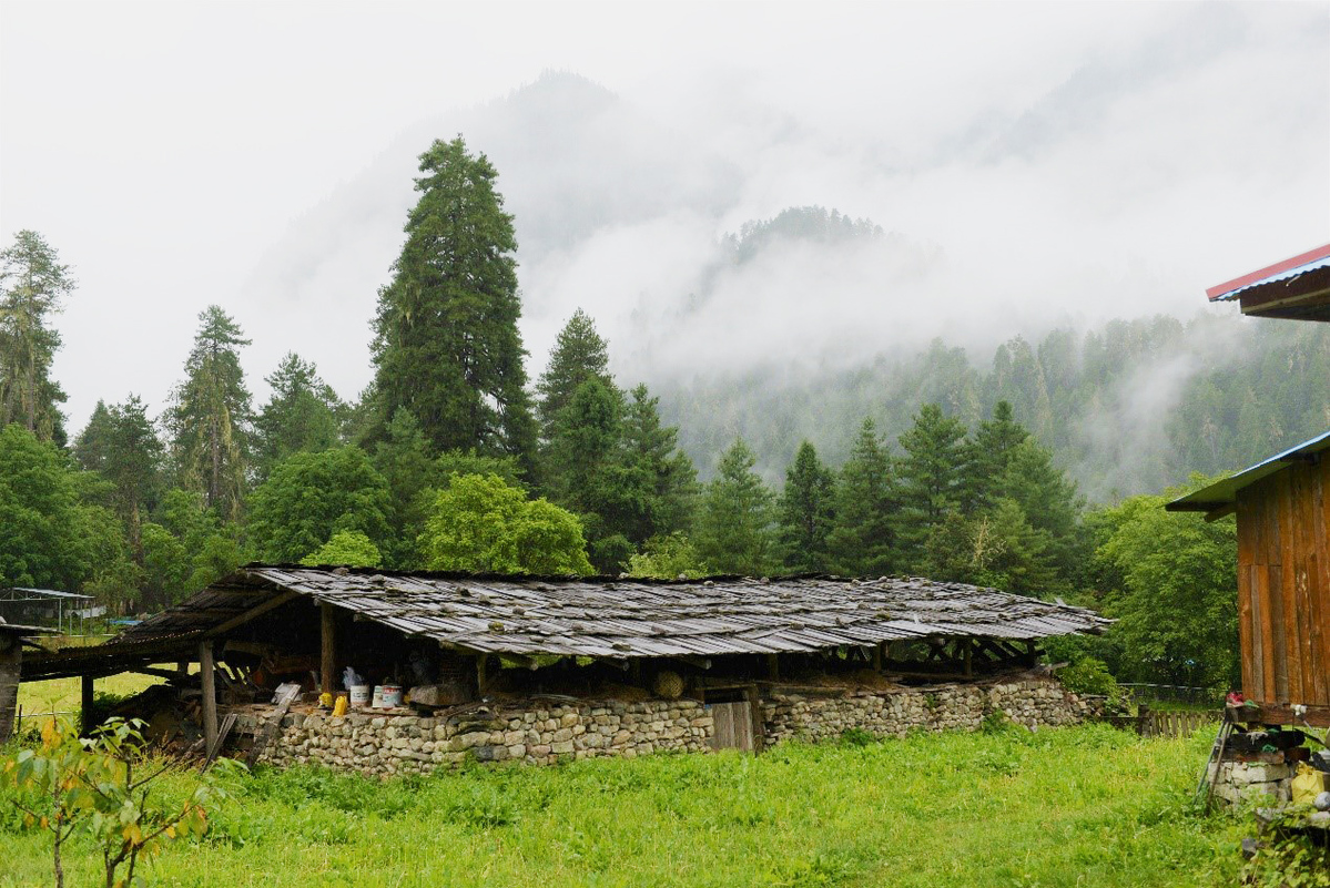 Farmhouses are seen in the deep spruce forest at Bomi county, Nyingchi city in Southwest China's Tibet autonomous region, on June 29, 2021. [Photo by Zhao Shiyue/chinadaily.com.cn]