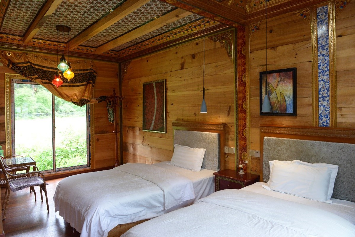 A bedroom of a family hotel is warm and welcoming in Baka village, Bomi county, Nyingchi city in Southwest China's Tibet autonomous region, on June 29, 2021. [Photo by Zhao Shiyue/chinadaily.com.cn]