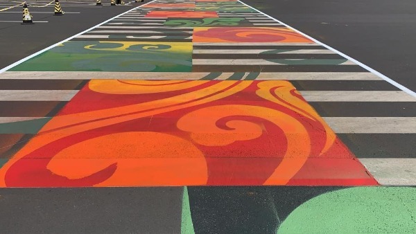 Some zebra crossings were restyled with colorful designs, including hearts and clouds, in Khiyabagsh, Ordos, Inner Mongolia autonomous region on Thursday. [Photo by Liu Yanan and Sun Haibin/chinadaily.com.cn]