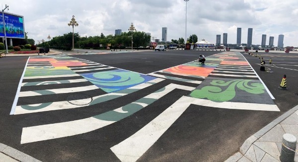 Some zebra crossings were restyled with colorful designs, including hearts and clouds, in Khiyabagsh, Ordos, Inner Mongolia autonomous region on Thursday. [Photo by Liu Yanan and Sun Haibin/chinadaily.com.cn]