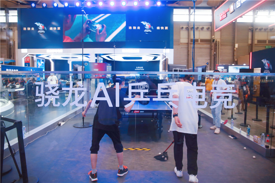 A visitor, left, plays AI ping-pong esports at the China Digital Entertainment Expo & Conference, or ChinaJoy, in Shanghai on July 30, 2021. [Photo/IC]