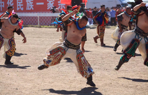 Mongolian wrestlers practice bokh (Mongolian wrestling) on the grassland to celebrate the opening ceremony. Wrestling is considered one of "the three games of men" by Mongolians. The sport, along with horsemanship and archery, forms the basis of competitive events at the Nadam Fair, which is held annually in midsummer. [Photo/Inner Mongolia Department of Culture and Tourism]