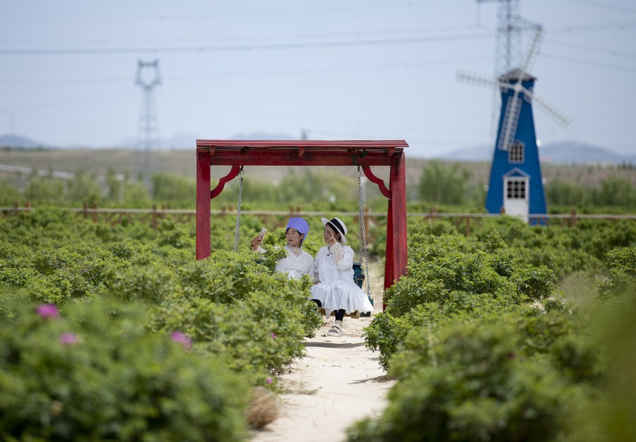 Tourists visit a rose plantation in Shengfeng Eco-tourism Park in Tongxin county, Northwest China's Ningxia Hui autonomous region, June 22, 2021. [Photo/Xinhua]