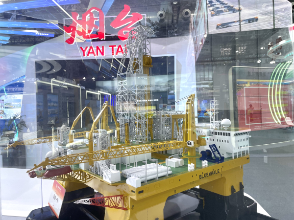 The model of Blue Whale 1, the ultra-deep-water semisubmersible drilling rig, was also displayed. Developed by CIMC Raffles, Blue Whale 1 succeeded in collecting samples of combustible ice in the South China Sea in July 2017.