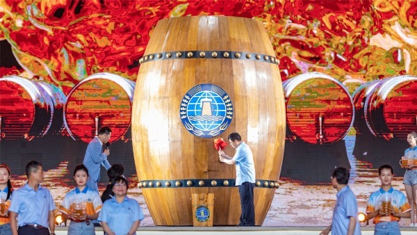Qingdao mayor Zhao Haozhi opens the first barrel of beer for the 31st Qingdao International Beer Festival with a remarkable and classic ritual. [Photo provided to chinadaily.com.cn]
