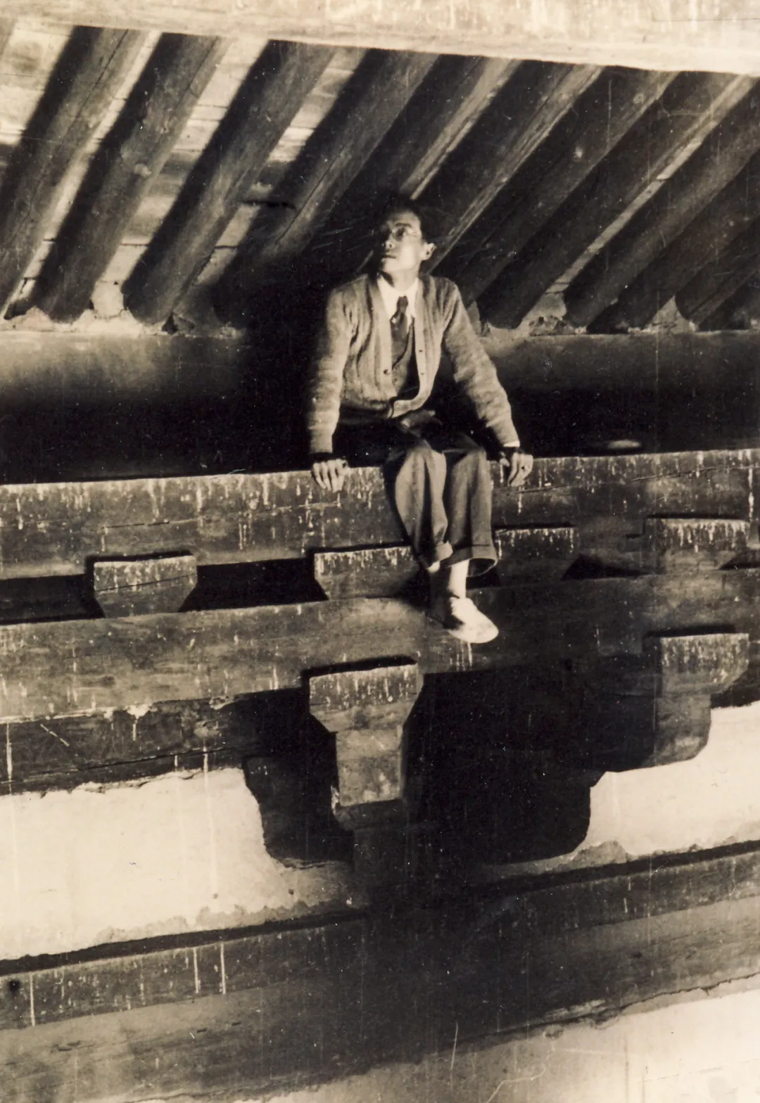 A photo taken in 1933 showing Liang Sicheng while doing surveying and mapping at Puhua Temple, in Shanxi province. [Photo provided to China Daily]