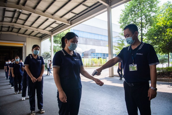 A staff member gets her temperature checked before entering a workshop of a company in Ningxiang, Changsha, Central China's Hunan province, Aug 3, 2021. [Photo/Xinhua]