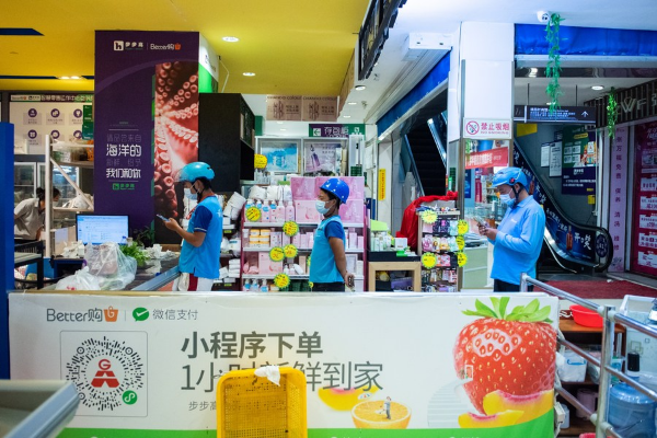 Deliverymen wait to collect customer orders at a supermarket in Yongding district in Zhangjiajie, Central China's Hunan province, Aug 5, 2021. [Photo/Xinhua]