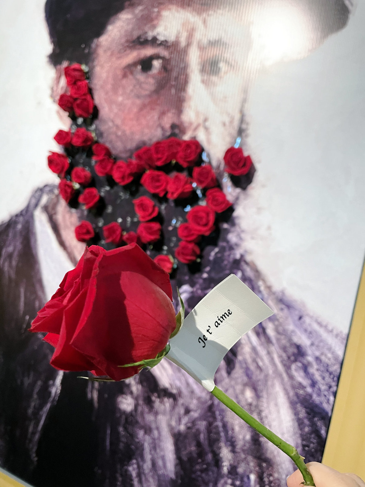 One is his self-portrait, to which the curators have added a bunch of red roses to cover the beard, while inviting visitors to select a rose and take a selfie with the artist on the canvas.