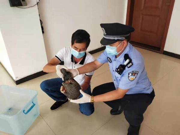 Local authorities check the health of a male pangolin found in Taimushan town of Fuding, a county-level city in Fujian province. [Photo provided to chinadaily.com.cn]
