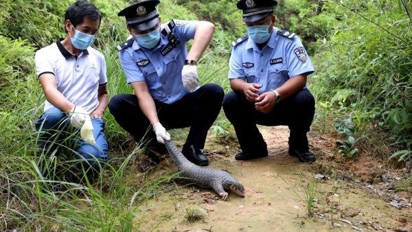 Local authorities save a male pangolin in Taimushan town of Fuding, a county-level city in Fujian province. [Photo provided to chinadaily.com.cn]