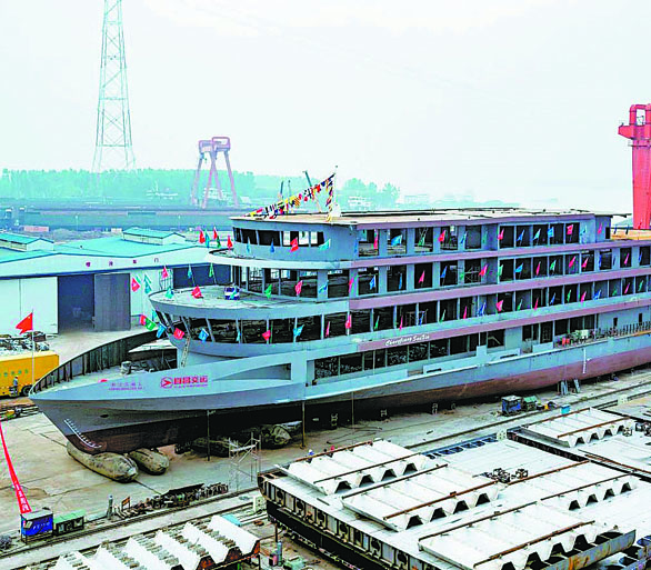 The hull construction of the world's largest purely electric-drive cruise ship has been completed in a shipbuilding industrial park in Yichang, Hubei province, in a step toward providing more options in the green growth of transportation on the Yangtze River.