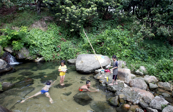 With better sewage treatment, the stream has become cleaner and tourists, especially children, like to have fun in the water.