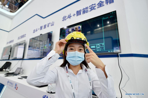 A staff member of China Telecom introduces an intelligent helmet at the fifth China-Arab States Expo in Yinchuan, Northwest China's Ningxia Hui autonomous region, Aug 20, 2021. [Photo/Xinhua]