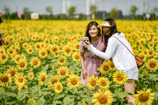 Tourists take selfies at the sunflower fields in Qilipu village. [Photo/IC]