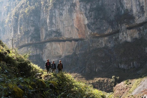 Residents check and clean their hand-built road along 470 meters of cliffs in Shibanhe village of Hezhang county, Guizhou province. [Photo by Han Xianpu/for chinadaily.com.cn]