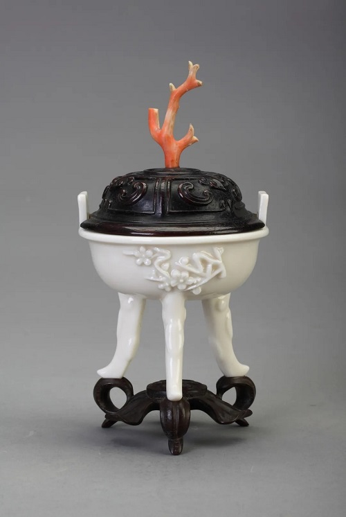 A porcelain tripod incense burner with a plum blossom motif, Qing Dynasty (1644-1911), Dehua ware,is exhibited at the Wuxi Museum in Jiangsu province.[Photo/wxmuseum.com]