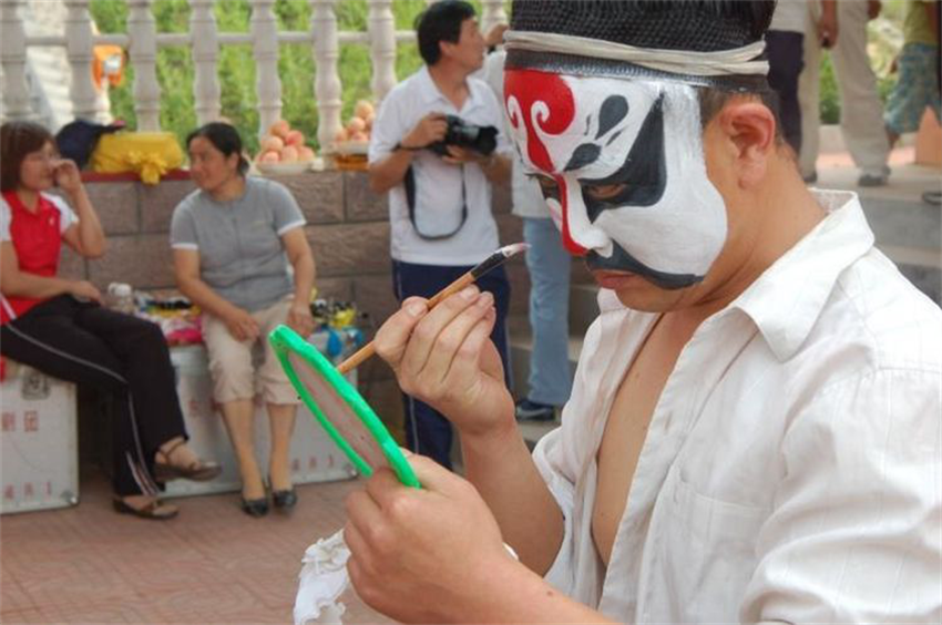 A Laiwu bangzi actress is painting his face before he performs. [Photo by Wang Ping/cri.cn]