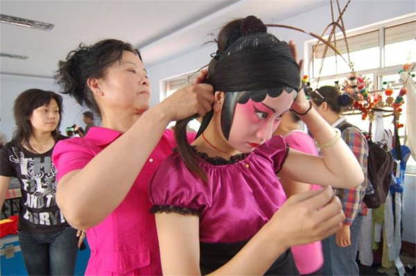 A Laiwu bangzi actress is arranging her hair accessories before performing. [Photo by Wang Ping/cri.cn]