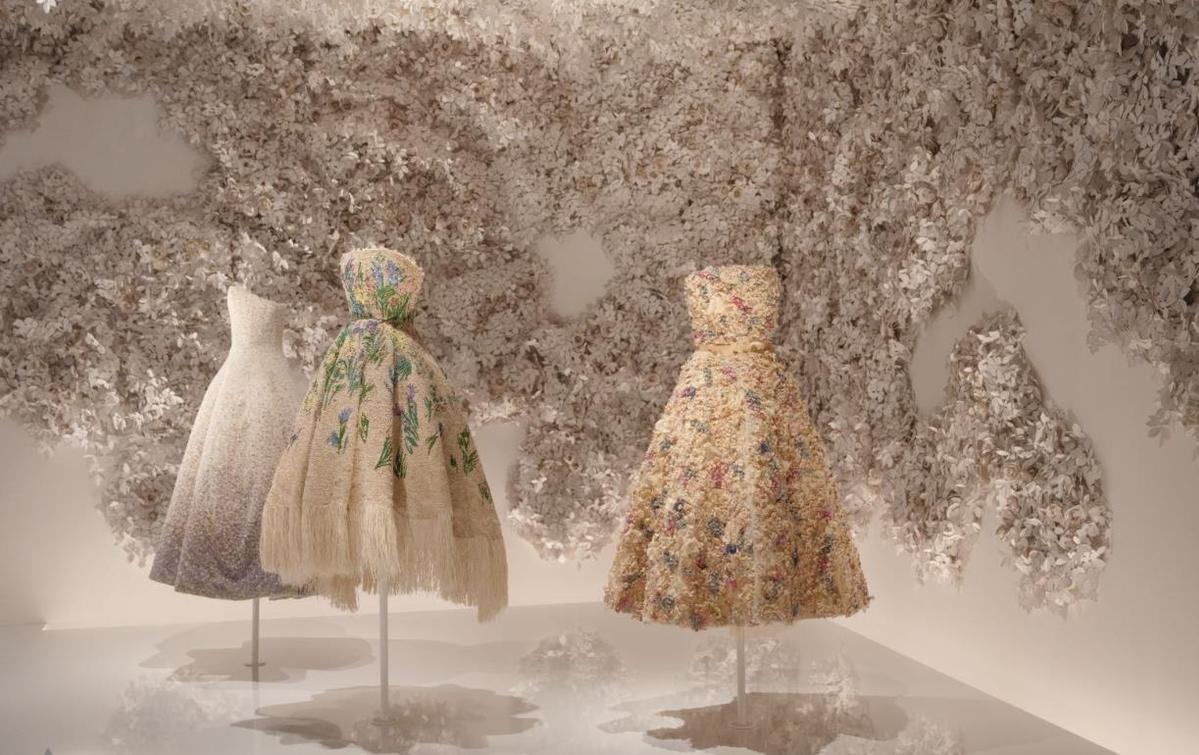 In the heart of an Enchanted Garden2, evoking Dior's fascination for flowers, the Miss Dior dress, designed in 1949 by the founding couturier, and its reinterpretation by Raf Simons for the Dior autumn-winter 2012-2013 haute couture collection, are displayed alongside the iconic fragrance of the same name.