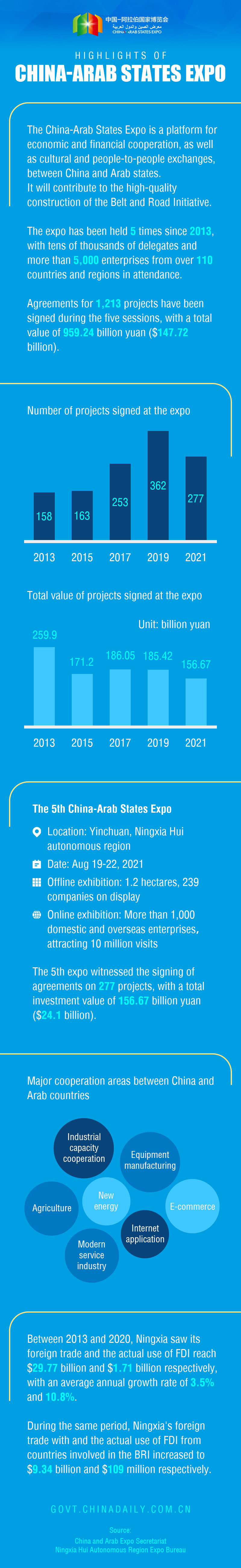 The China-Arab States Expo is a platform for economic and financial cooperation,as well as cultural and people-to-people exchanges,between China and Arab states. It will contribute to the high-quality construction of the Belt and Road Initiative.