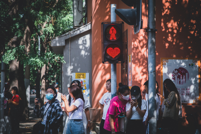 A signal lamp at the intersection features a heart icon. [Photo/IC]