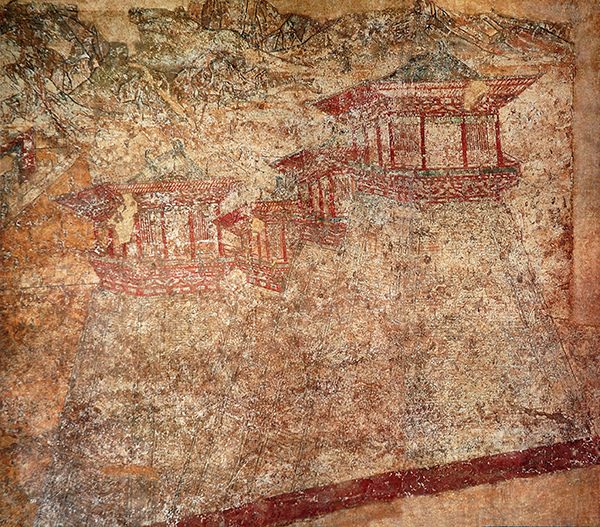 The murals on the east and west sides of the tomb corridor depict three folds of the palatial gate towers (que), reflecting the high-level painting skills of the Tang Dynasty.